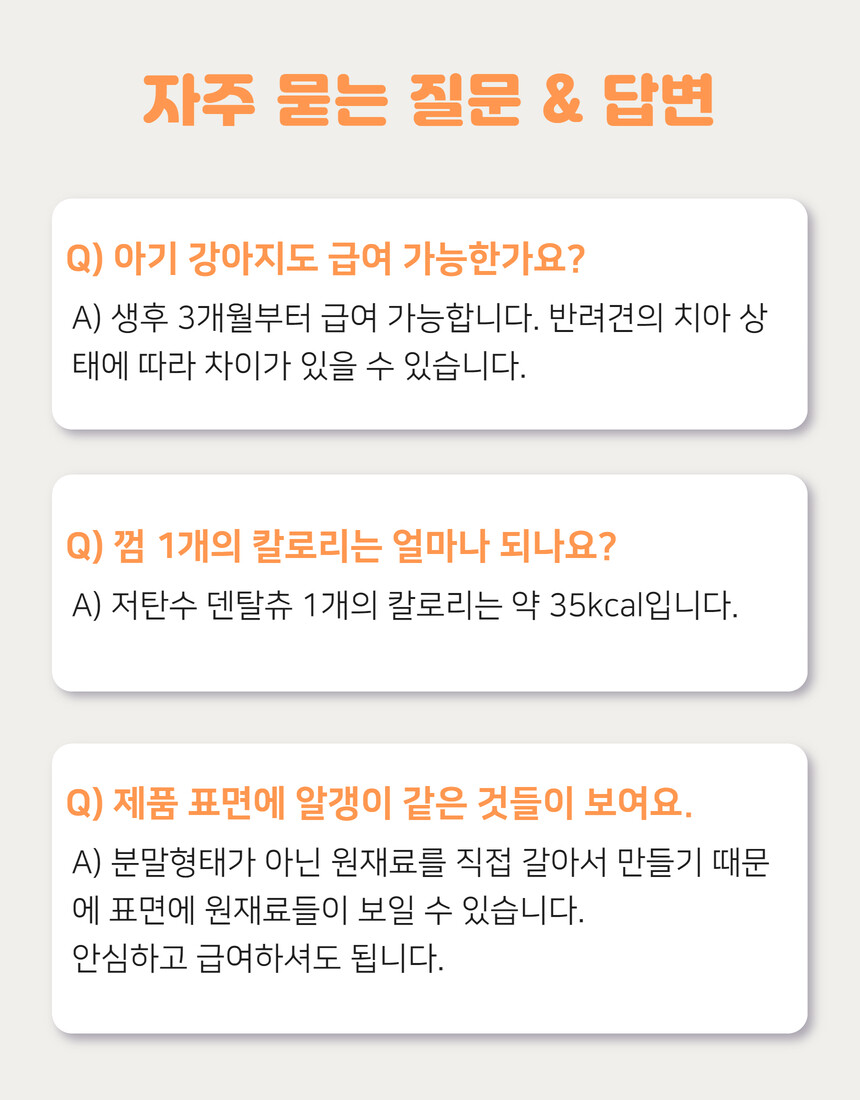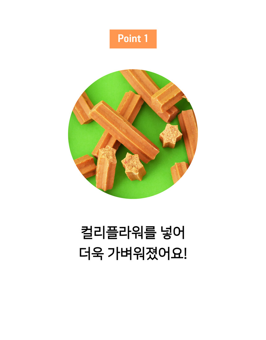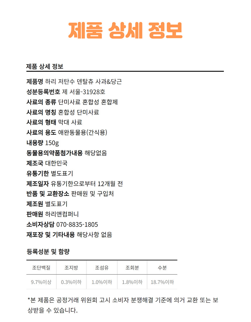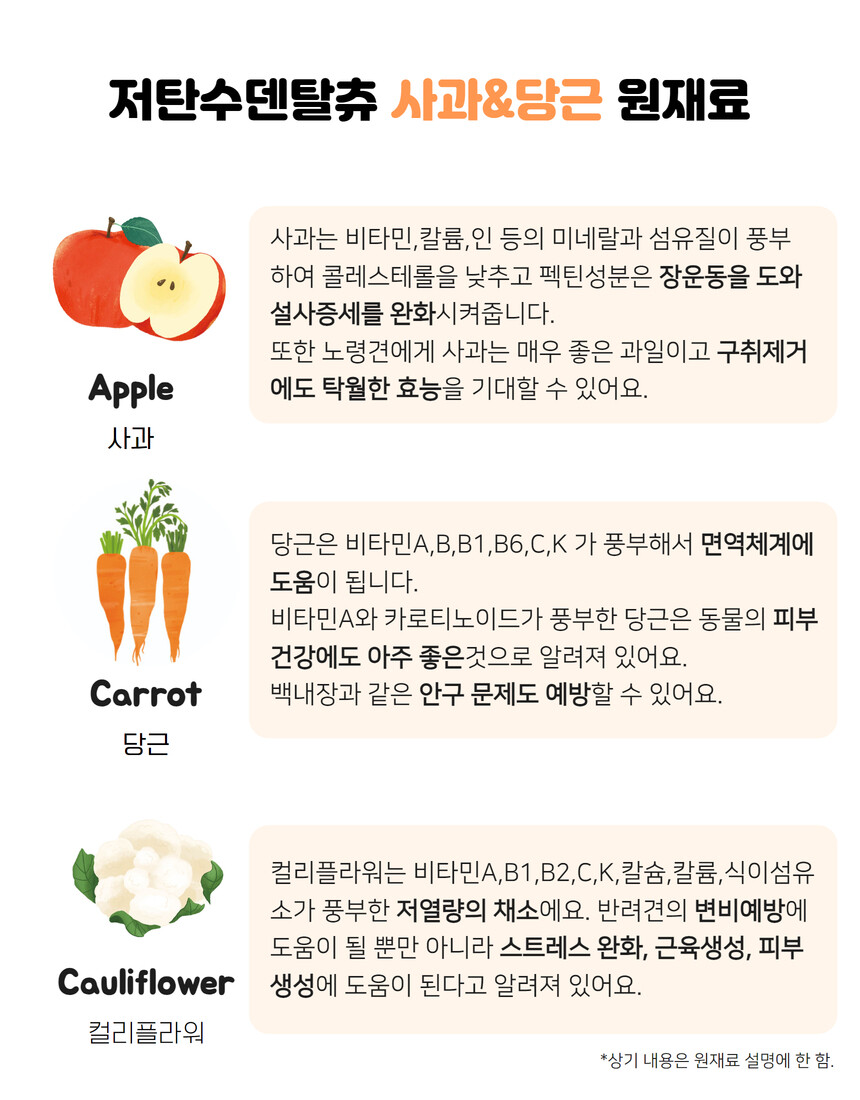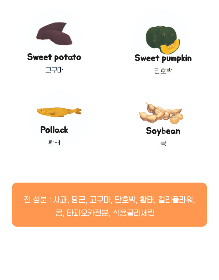 전 성분: 사과, 당근, 고구마, 단호박, 황태, 컬리플라워, 타피오카전분, 식용글리세린