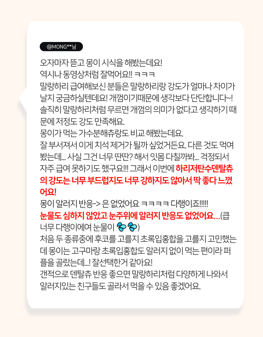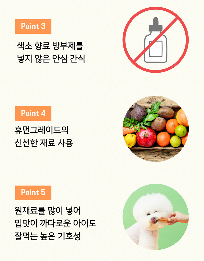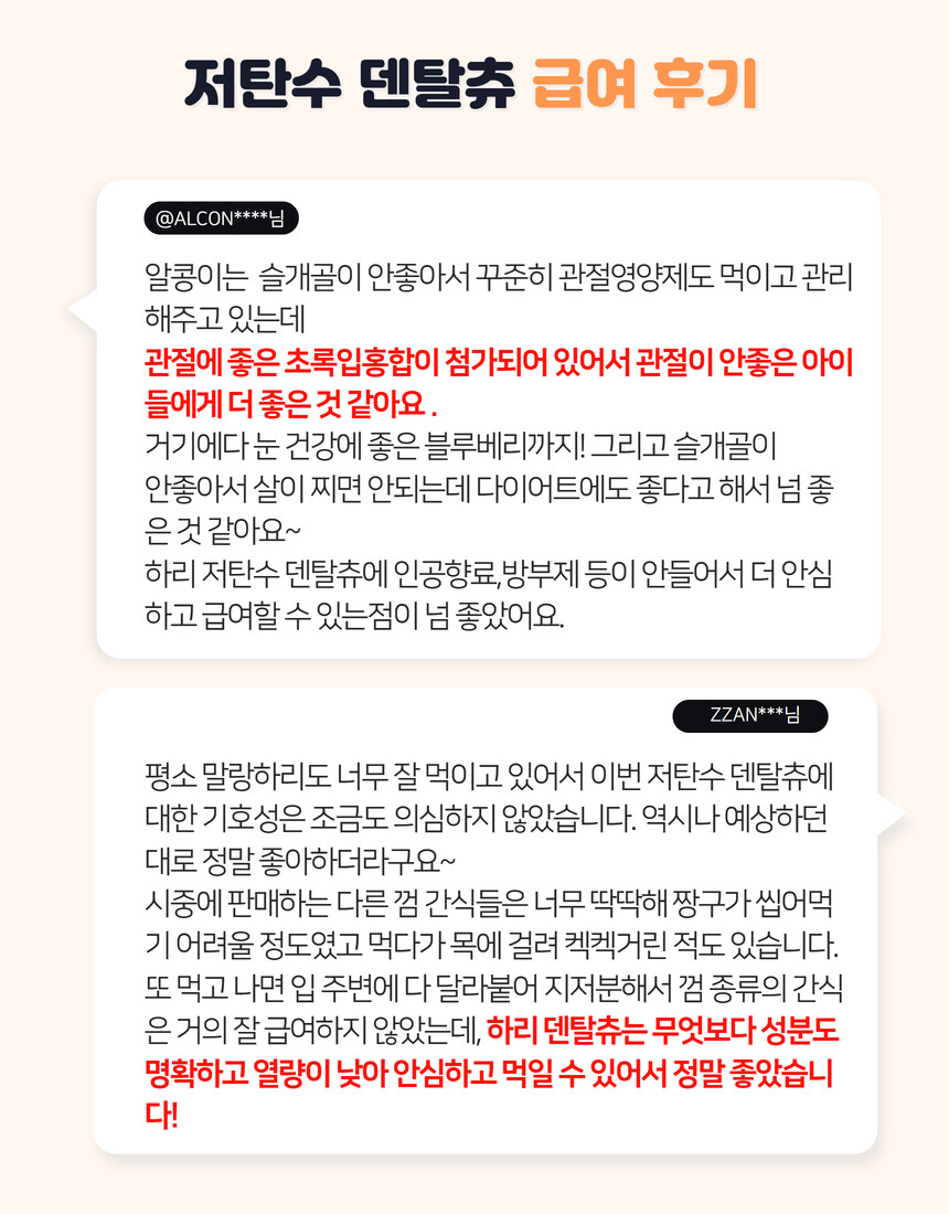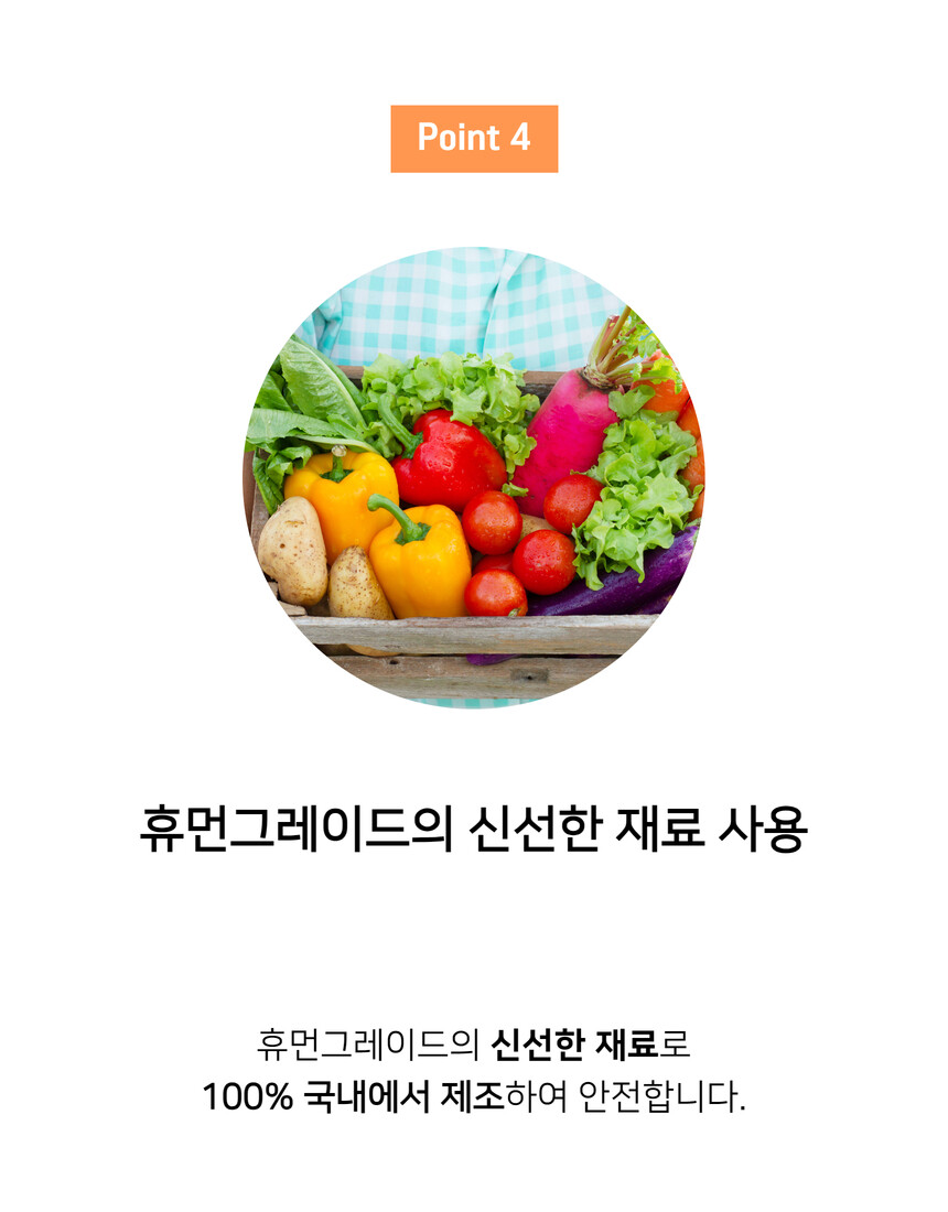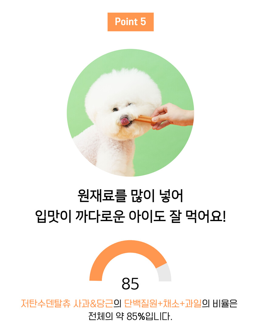 전 성분: 사과, 당근, 고구마, 단호박, 황태, 컬리플라워, 타피오카전분, 식용글리세린