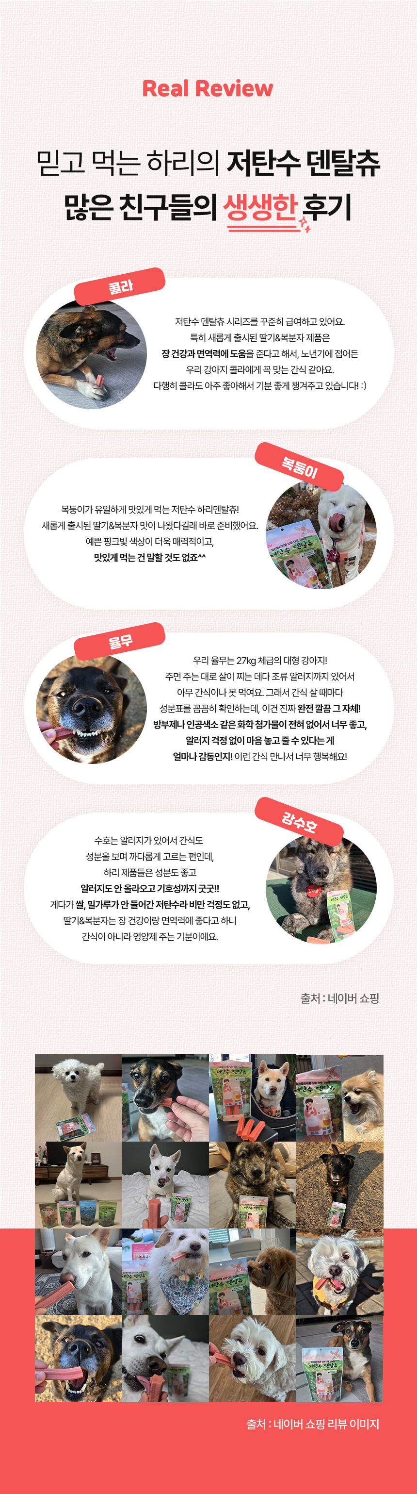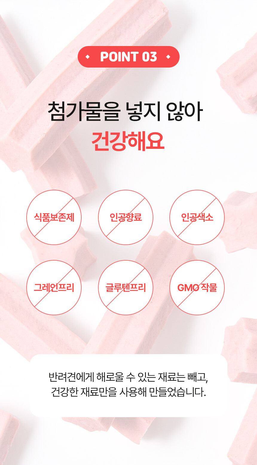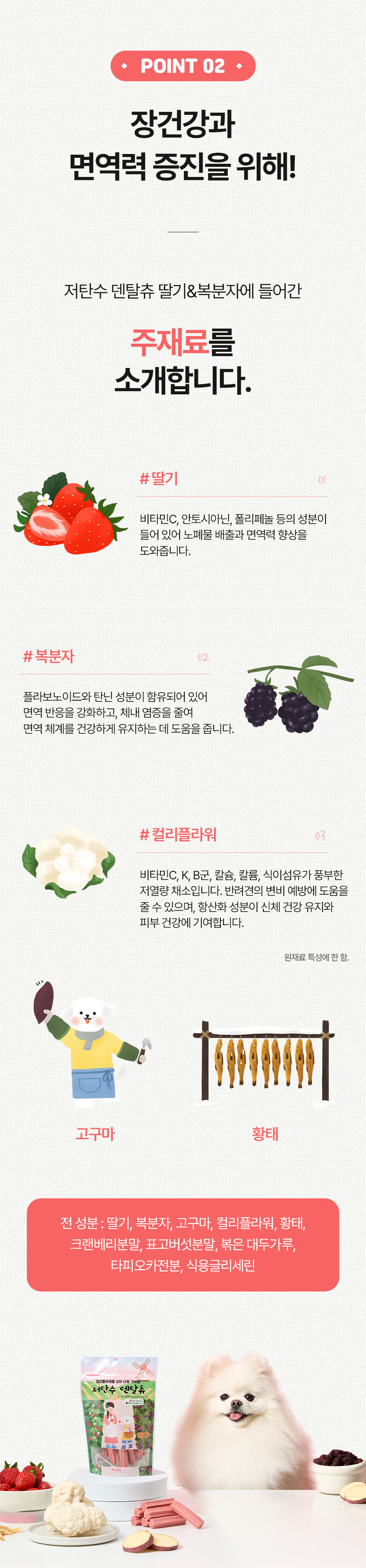 전 성분: 딸기, 복분자, 고구마, 컬리플라워, 황태, 크랜베리분말, 표고버섯분말, 볶은 대두가루, 타피오카전분, 식용글리세린