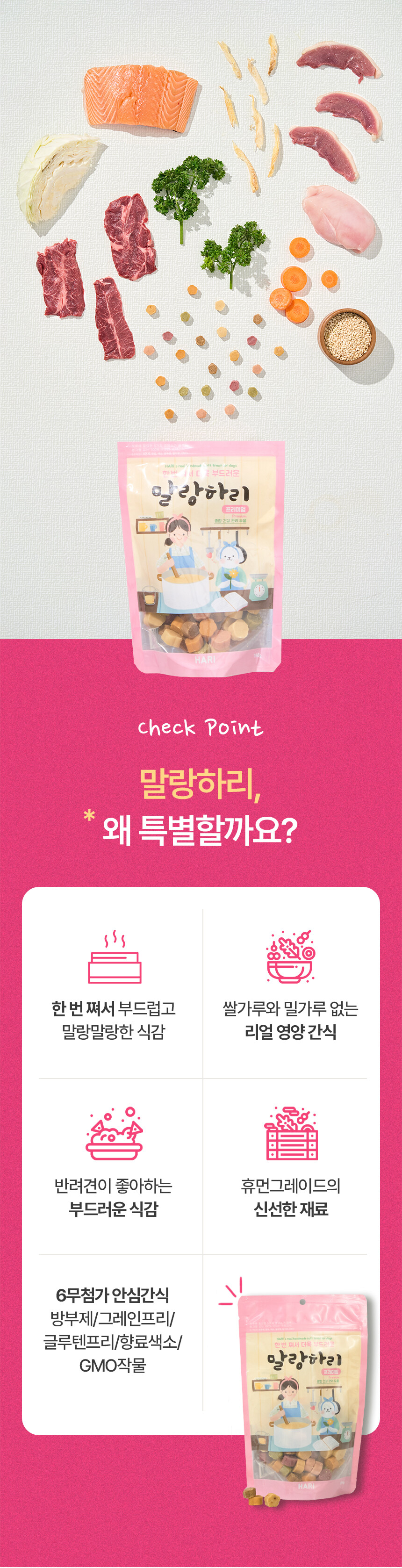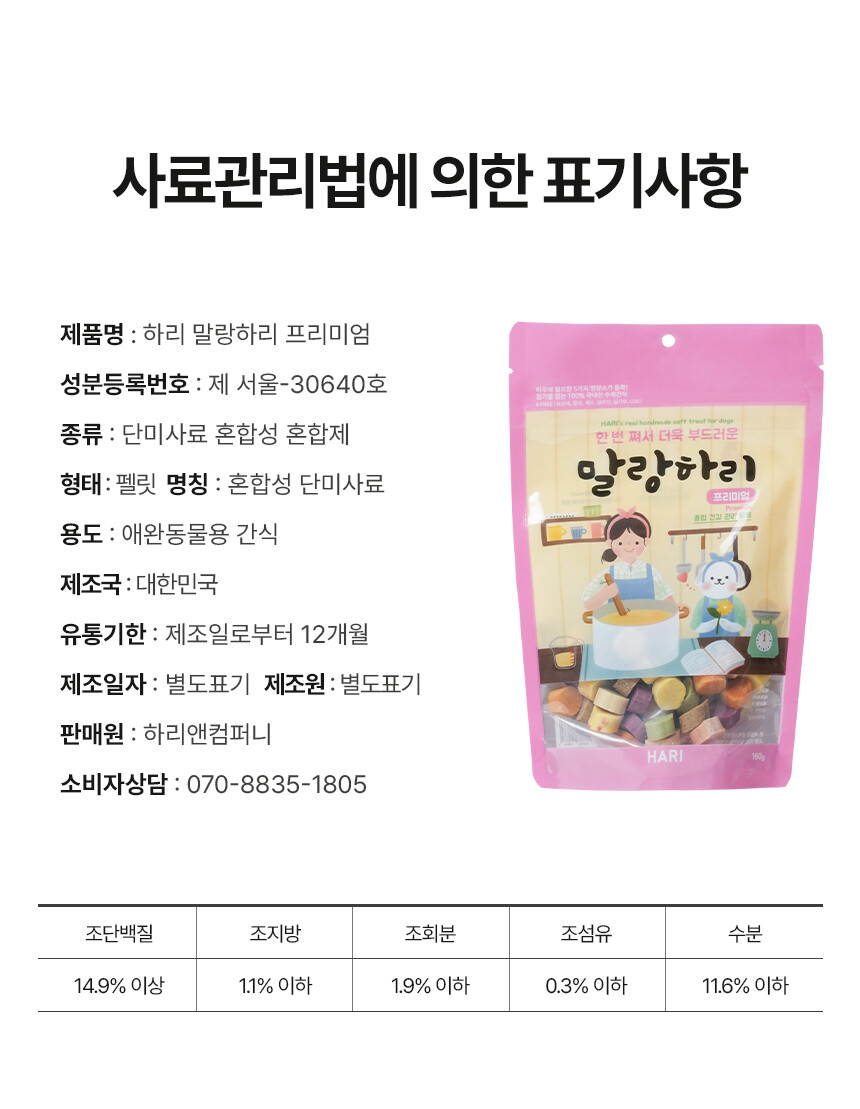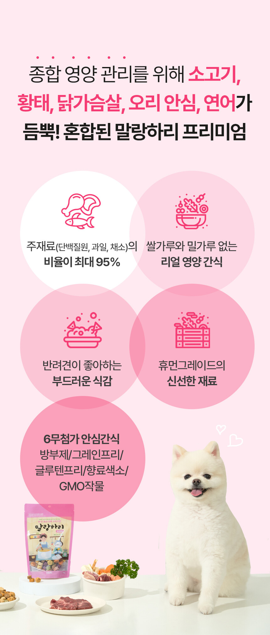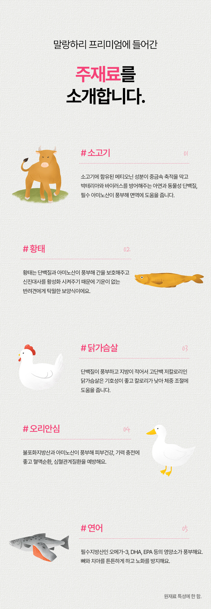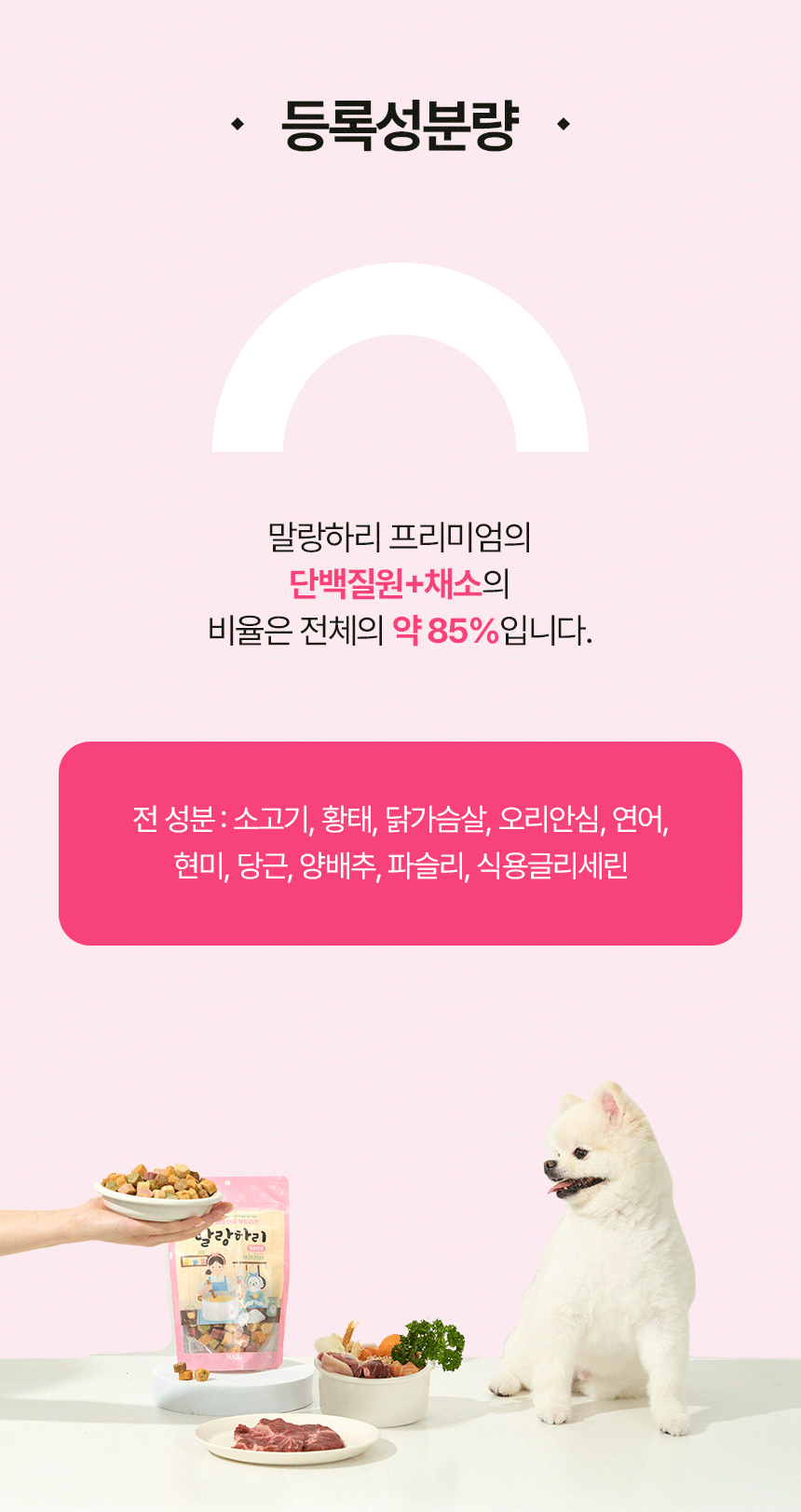 전 성분: 소고기(미국산), 황태(러시아산), 닭가슴살(국내산), 오리안심(국내산), 연어(노르웨이산), 현미, 당근, 양배추, 파슬리, 글리세린
