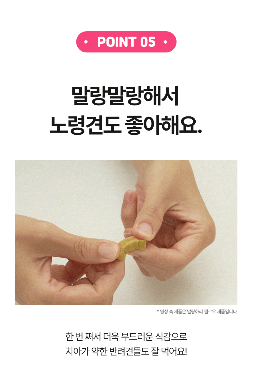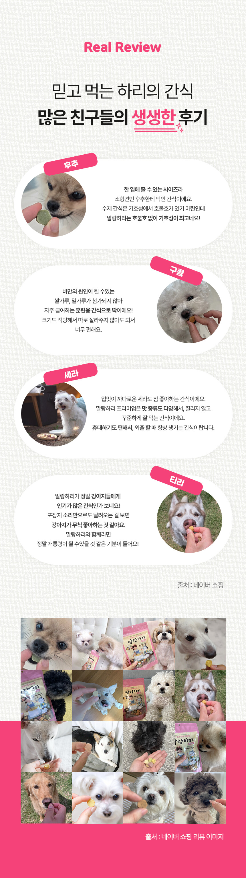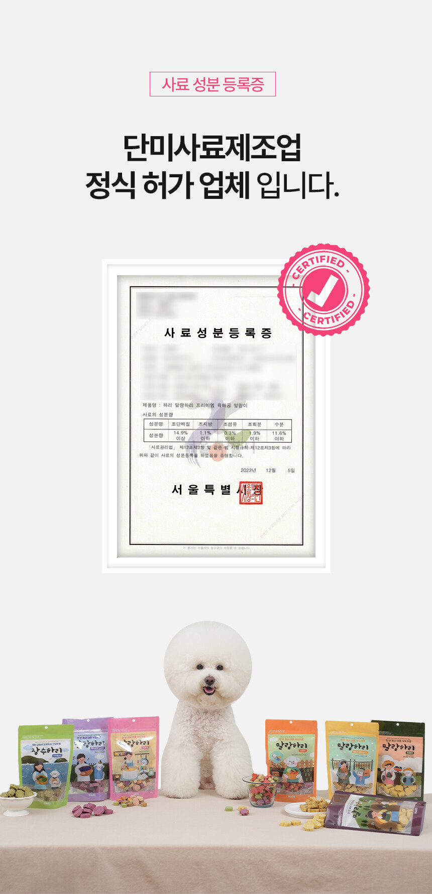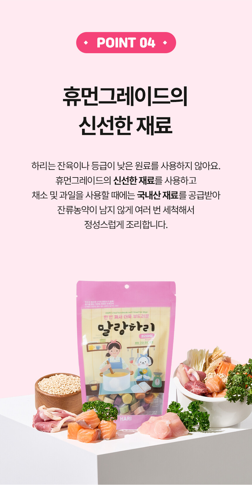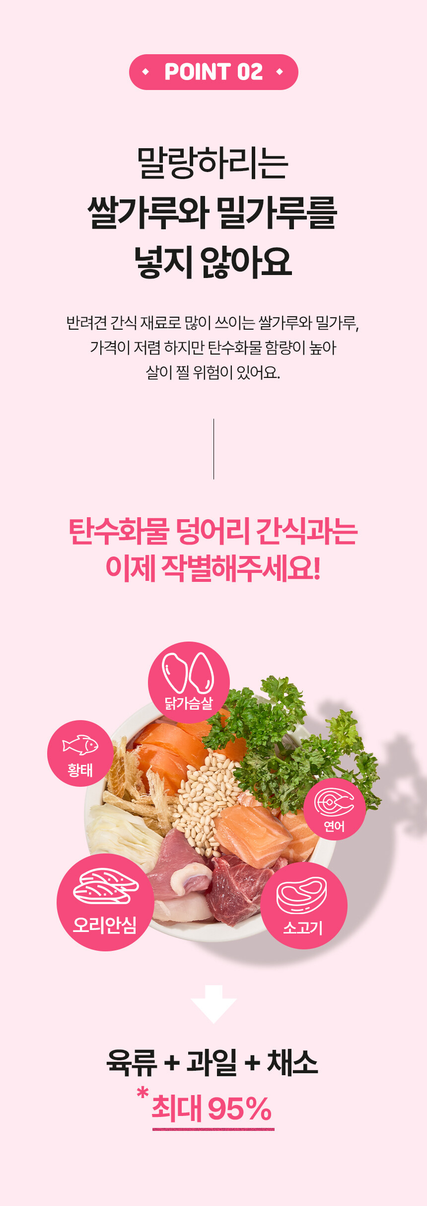 전 성분: 소고기(미국산), 황태(러시아산), 닭가슴살(국내산), 오리안심(국내산), 연어(노르웨이산), 현미, 당근, 양배추, 파슬리, 글리세린