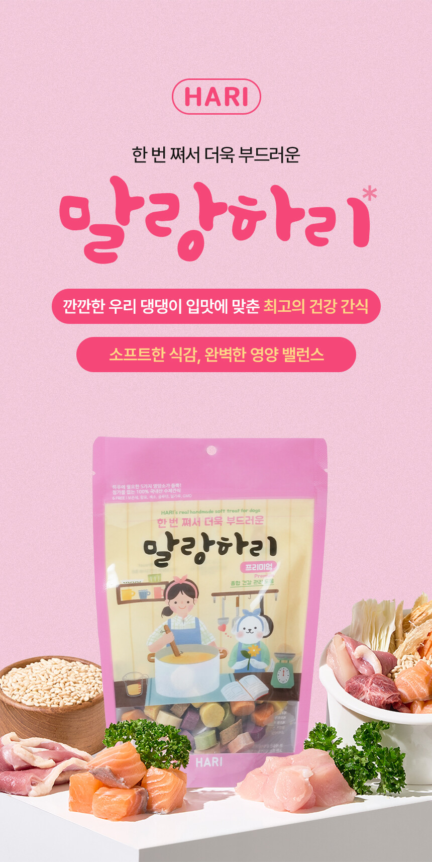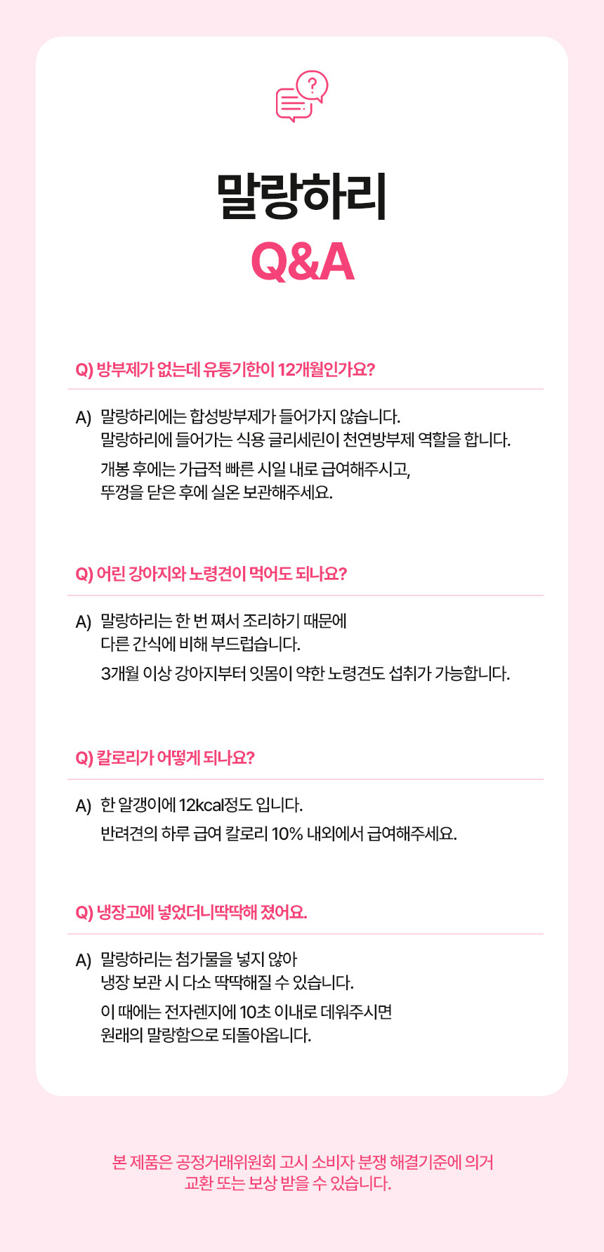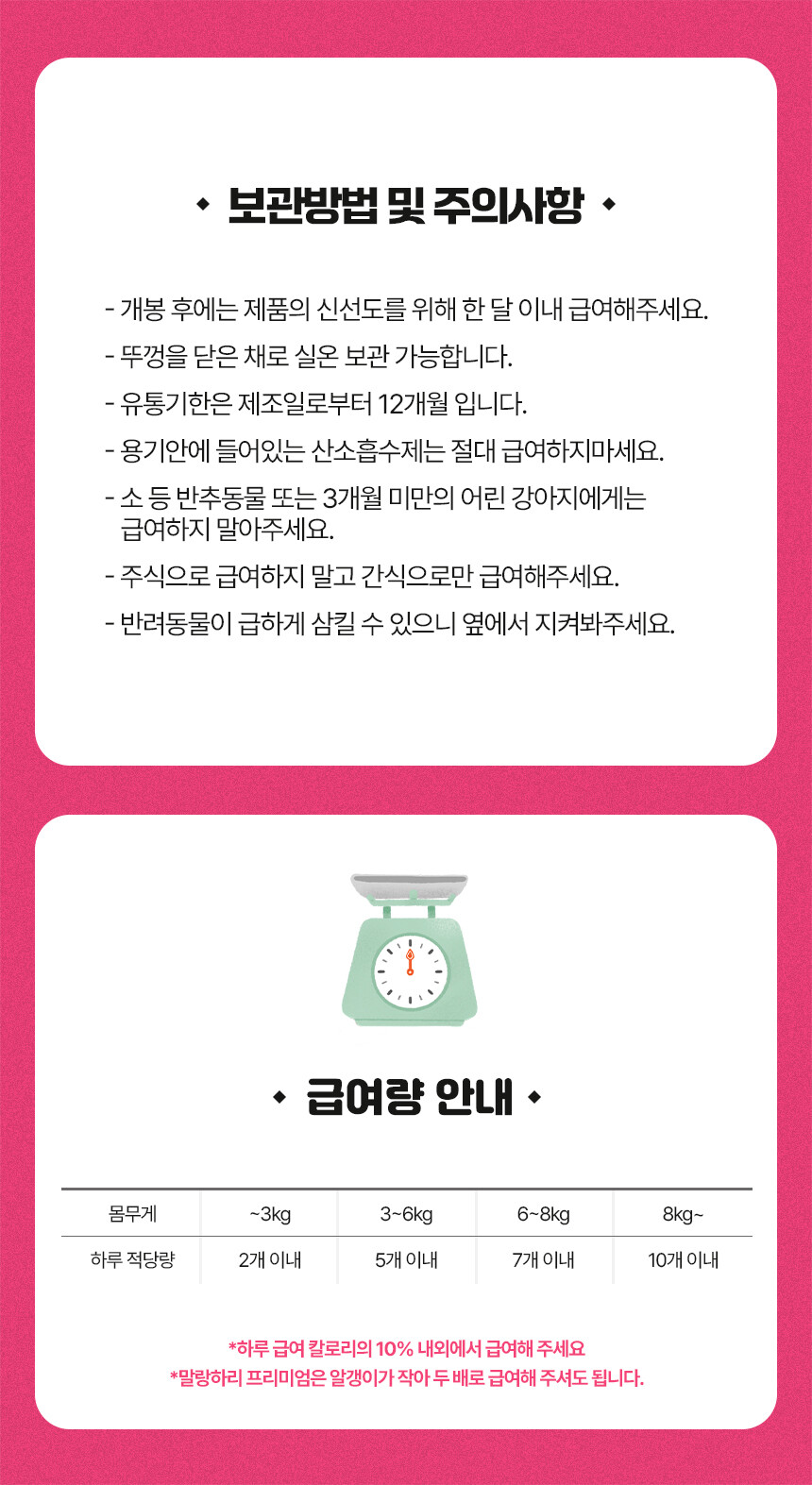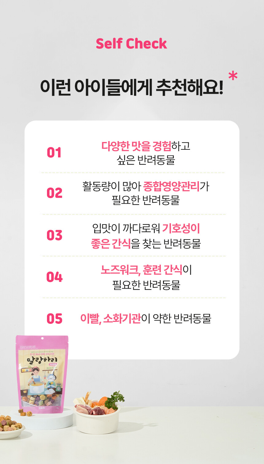 전 성분: 소고기(미국산), 황태(러시아산), 닭가슴살(국내산), 오리안심(국내산), 연어(노르웨이산), 현미, 당근, 양배추, 파슬리, 글리세린