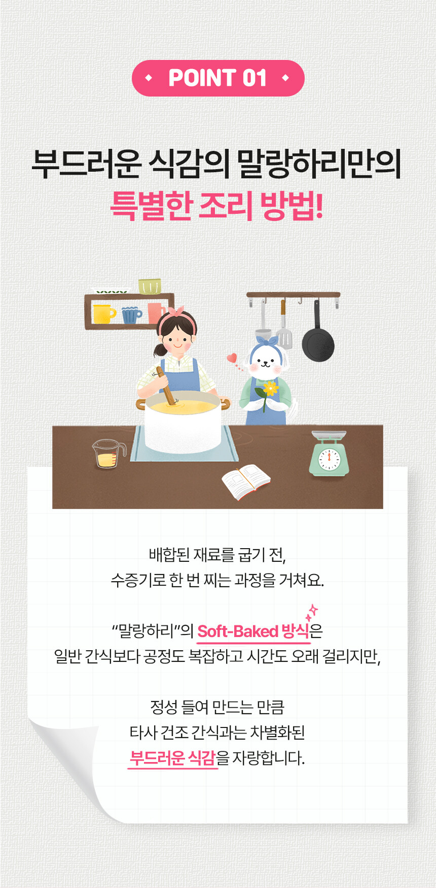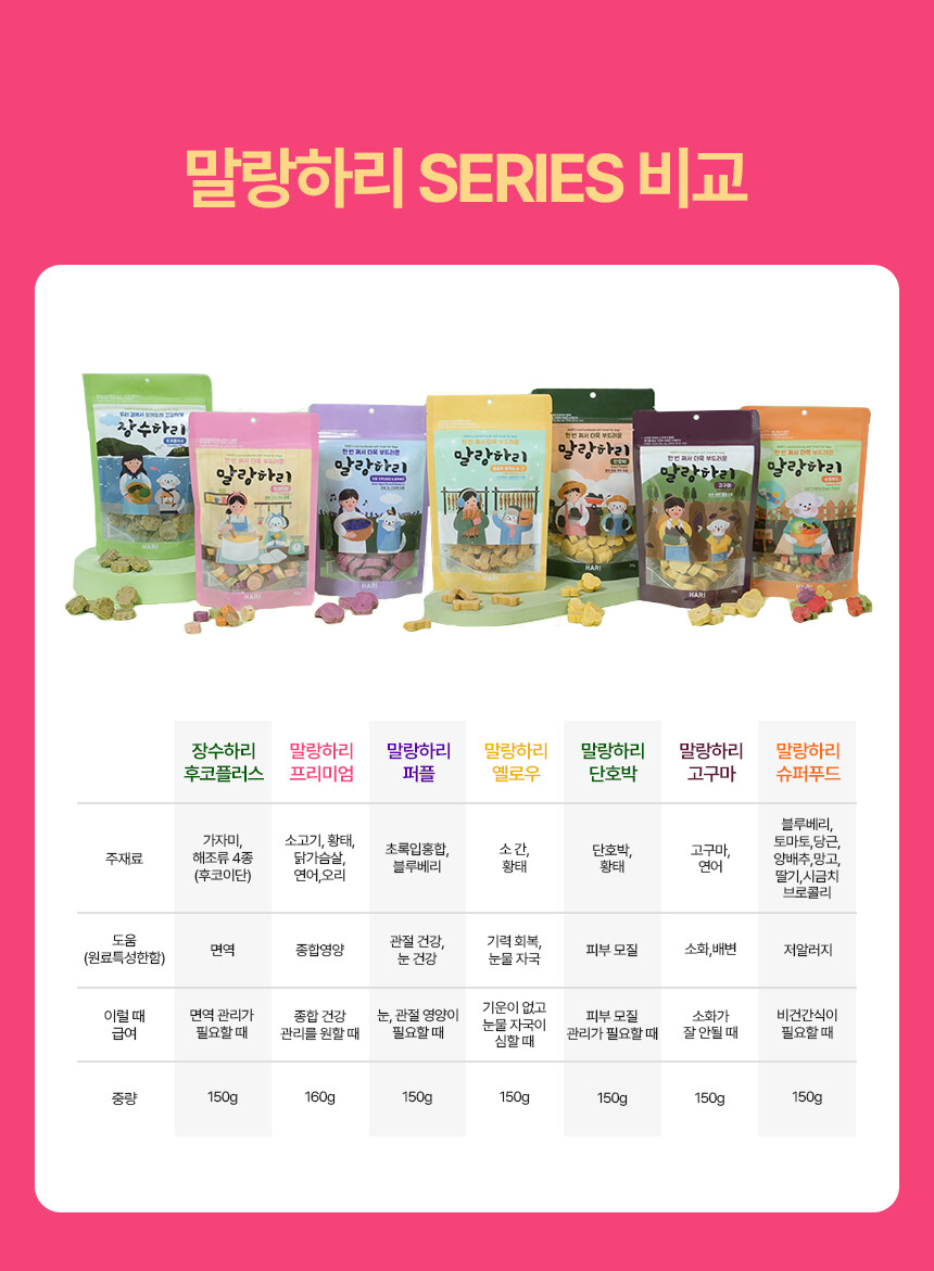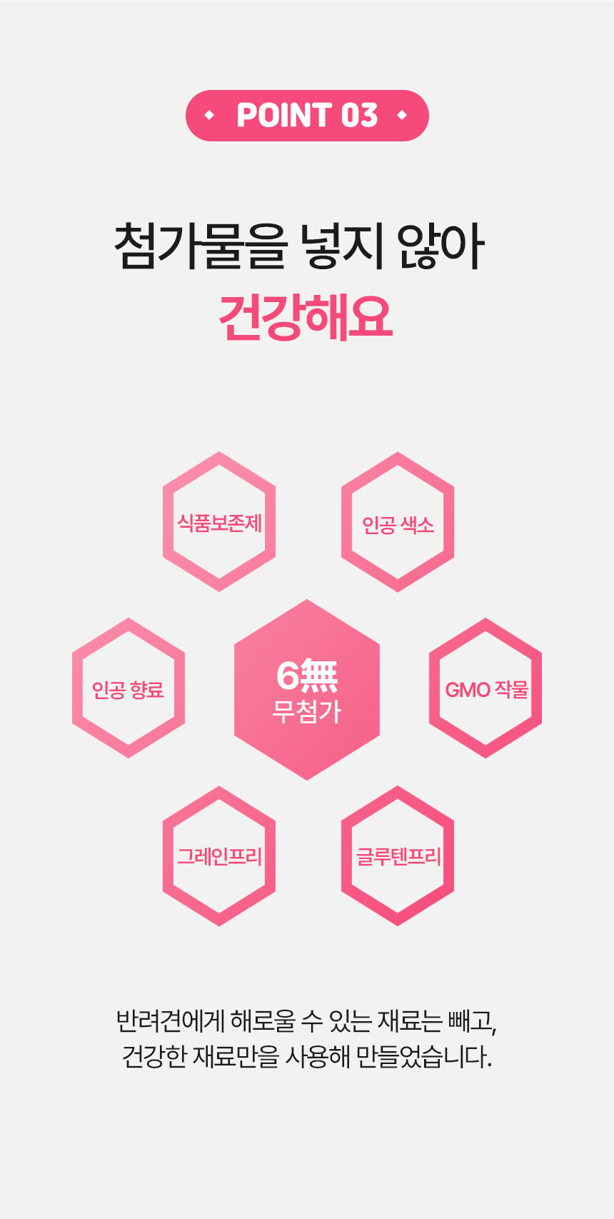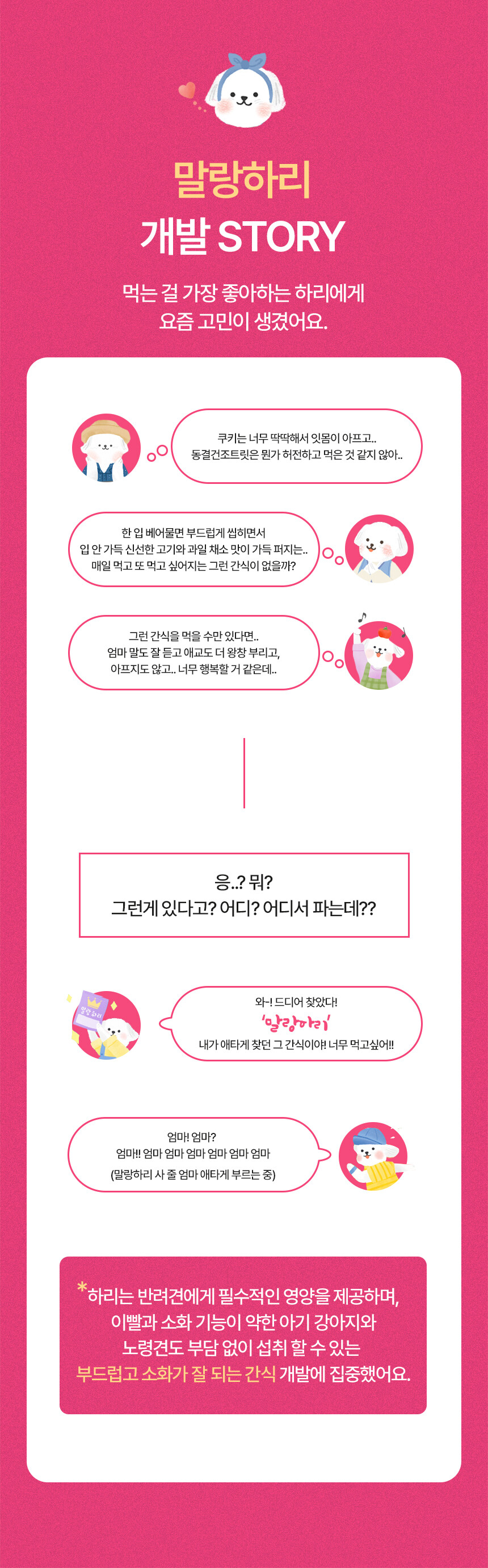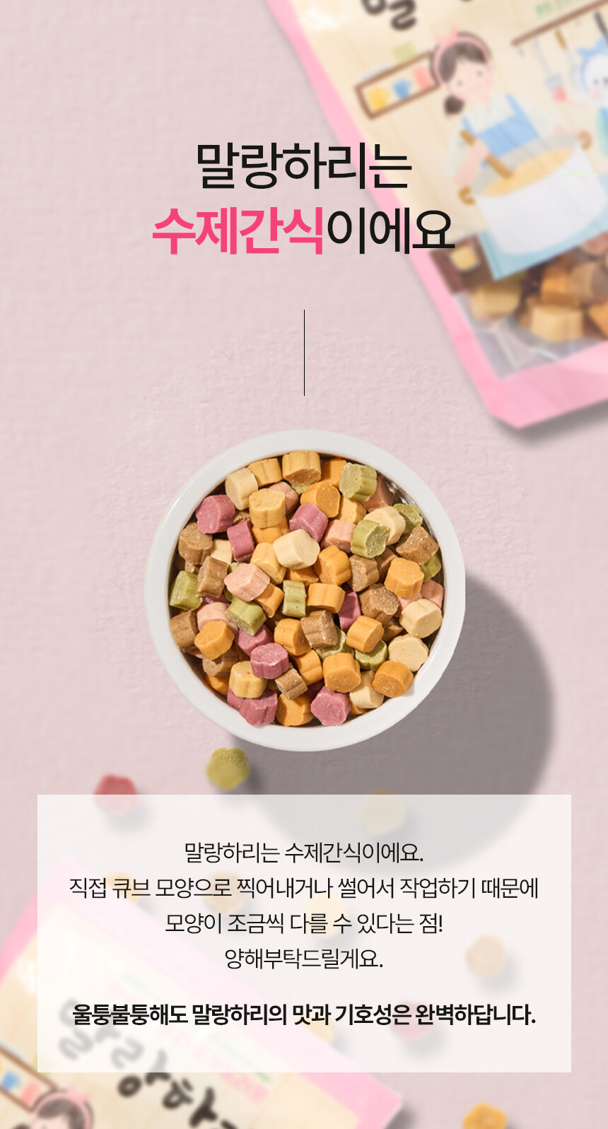 전 성분: 소고기(미국산), 황태(러시아산), 닭가슴살(국내산), 오리안심(국내산), 연어(노르웨이산), 현미, 당근, 양배추, 파슬리, 글리세린