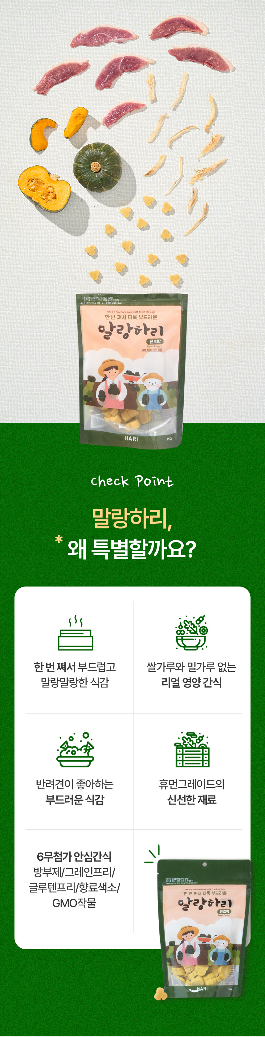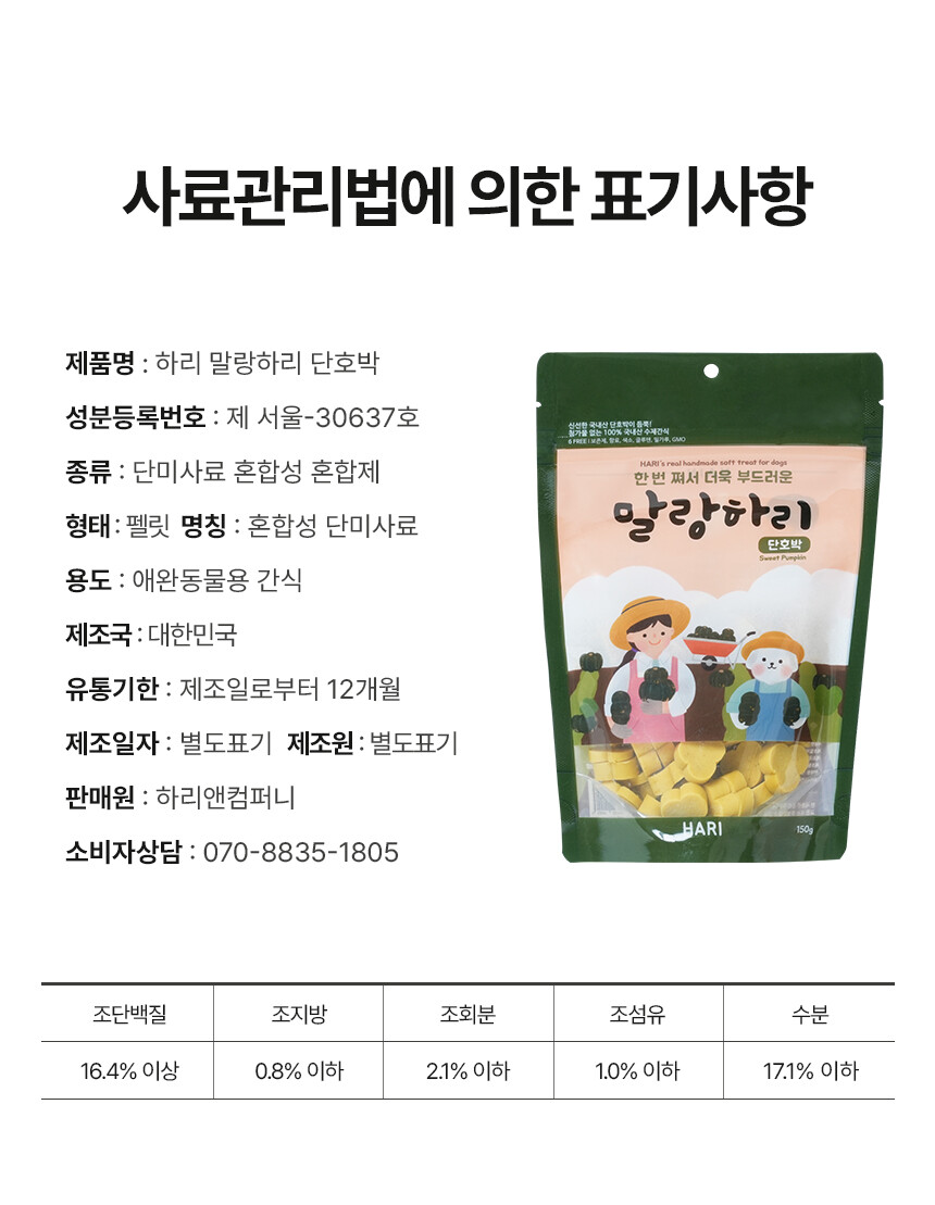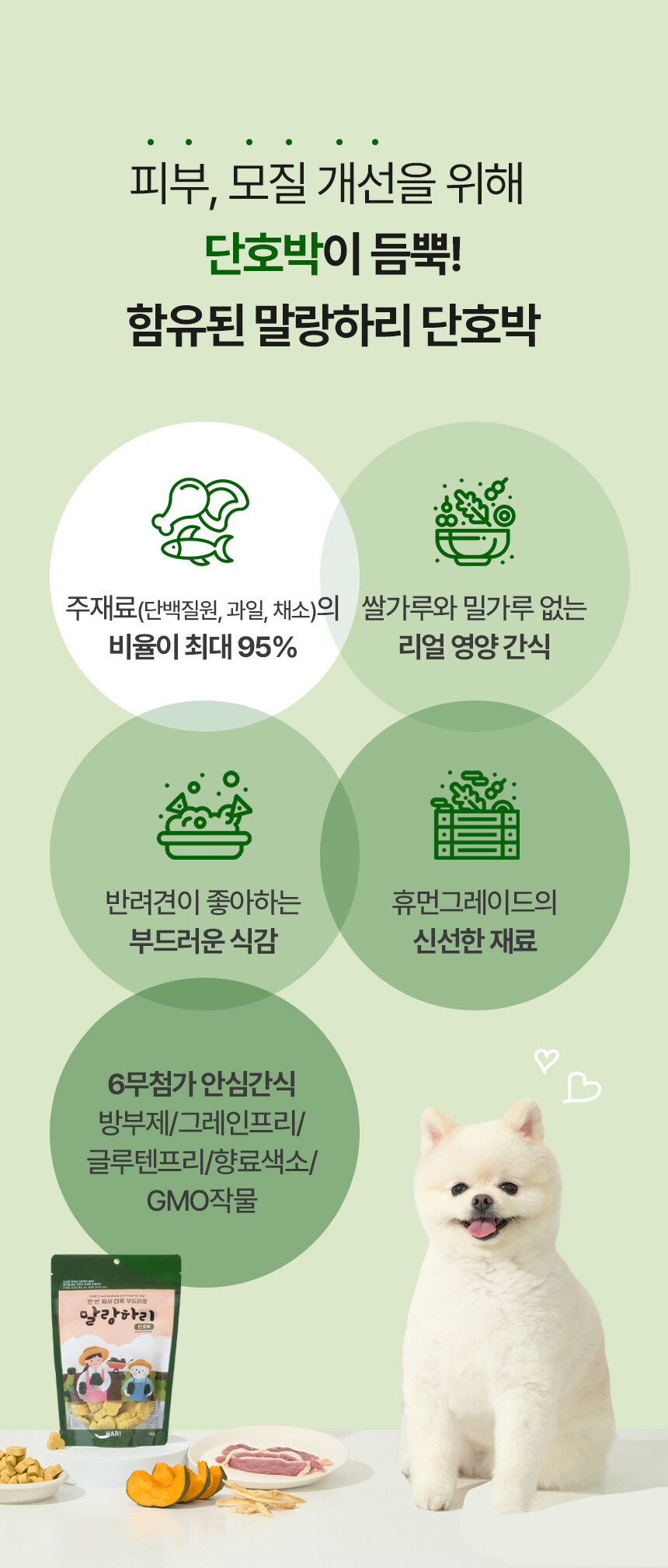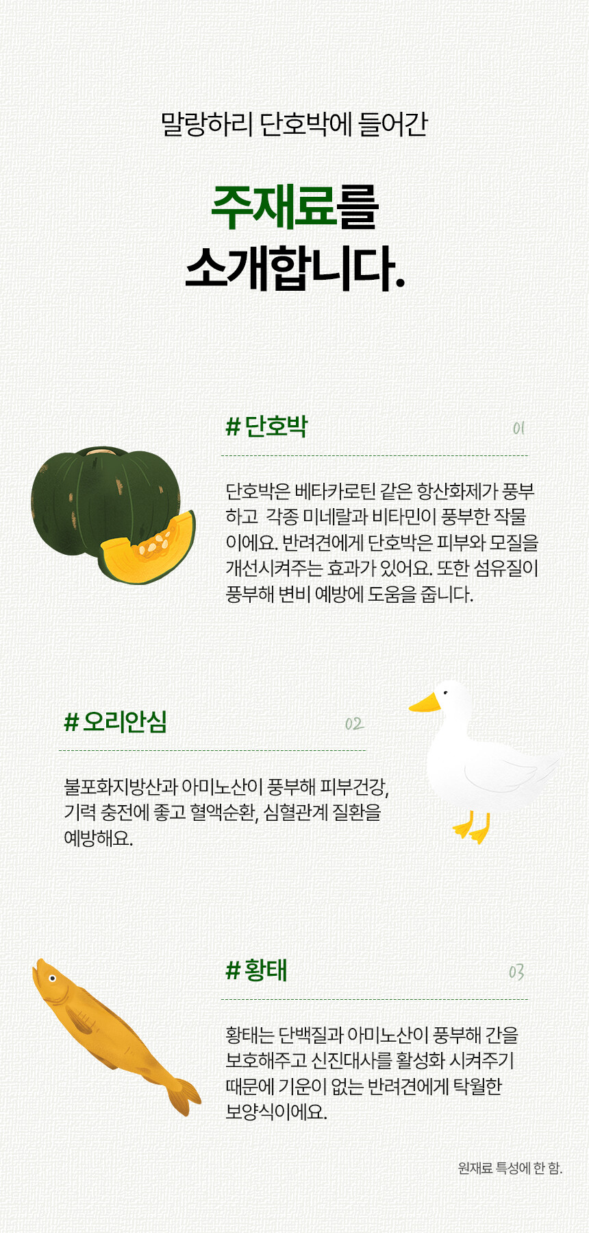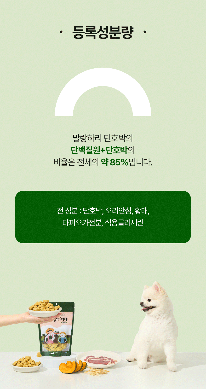 전 성분: 단호박 (국내산), 오리안심 (국내산), 황태 (러시아산), 타피오카전분, 글리세린