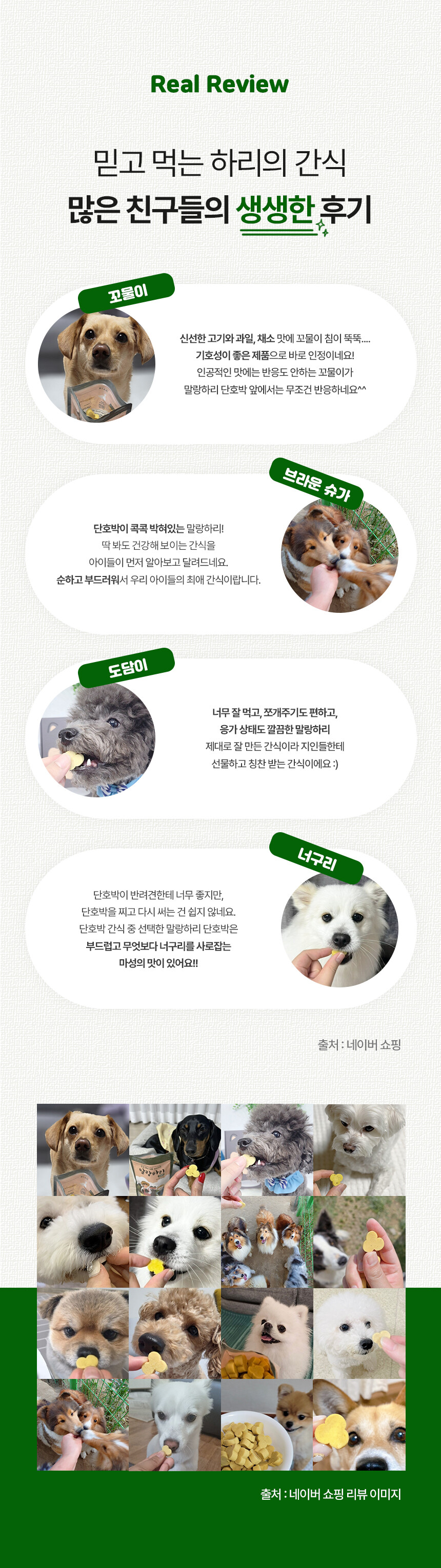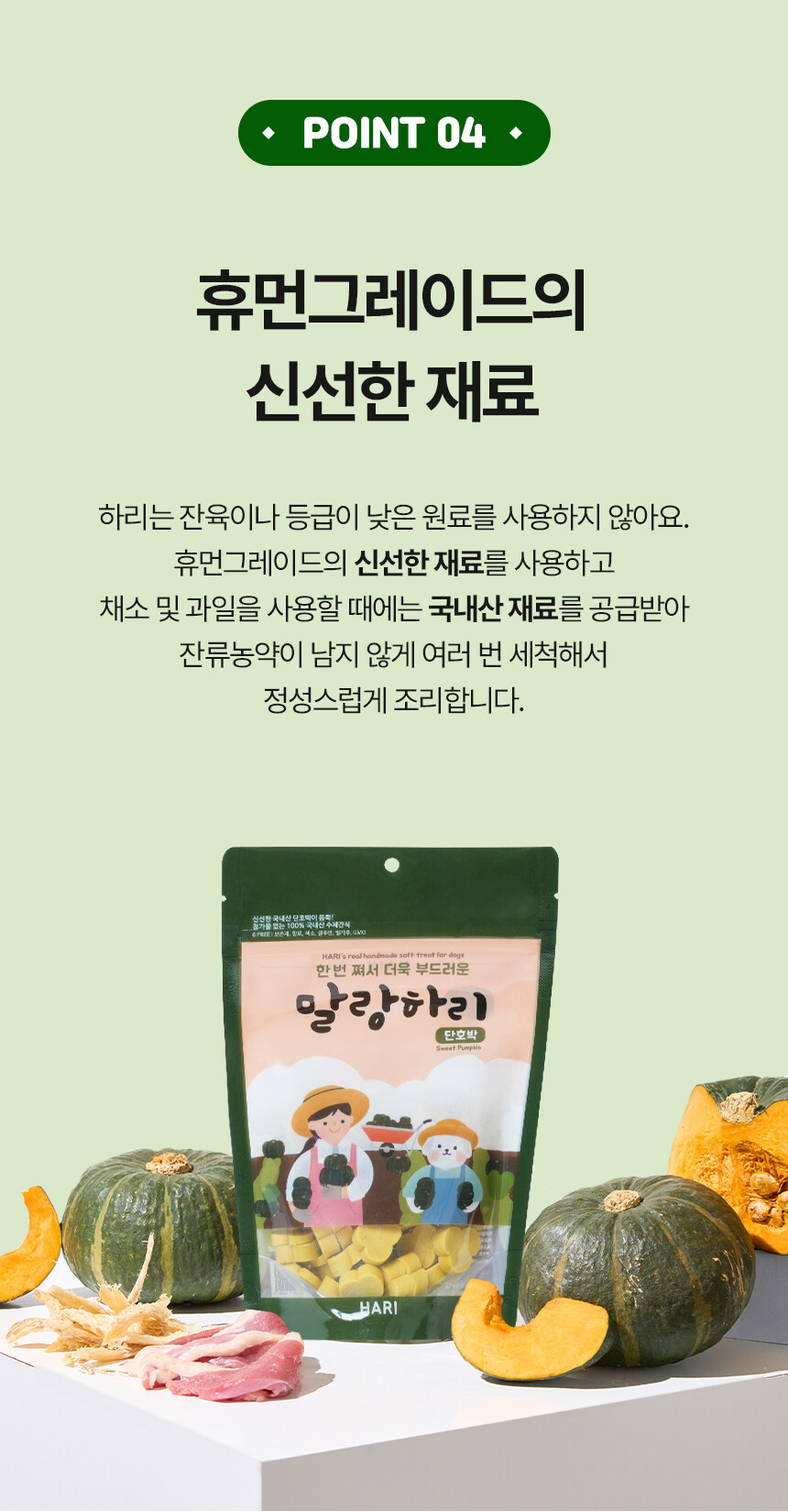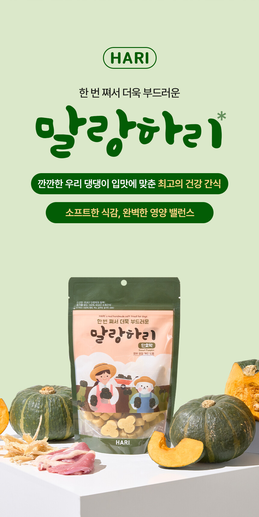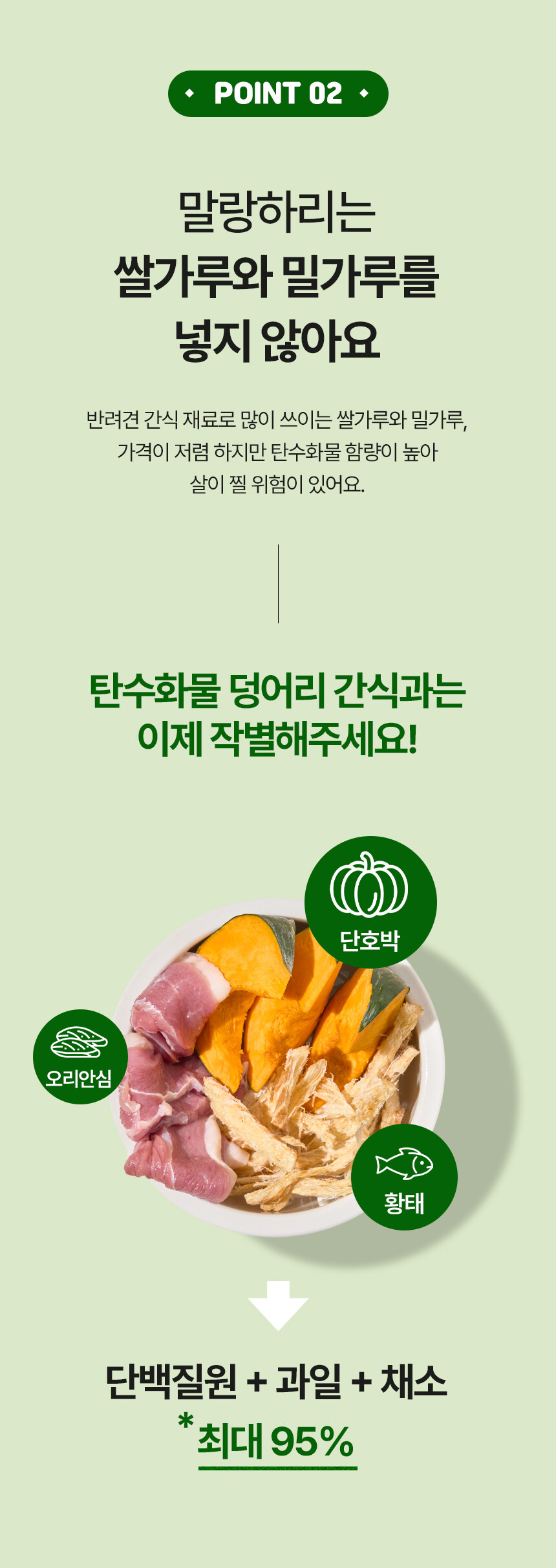 전 성분: 단호박 (국내산), 오리안심 (국내산), 황태 (러시아산), 타피오카전분, 글리세린