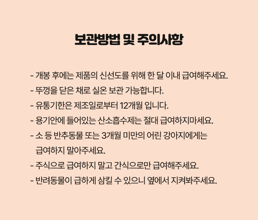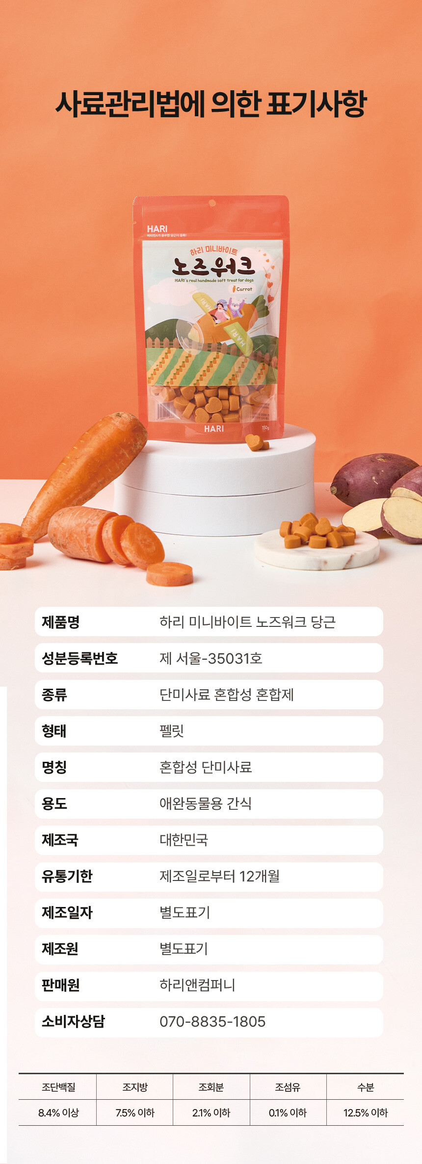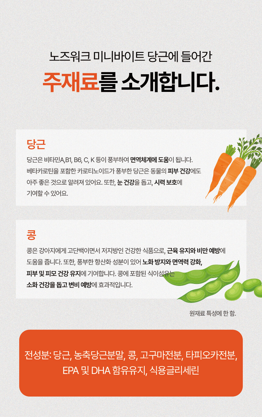 전 성분: 당근, 농축당근분말, 콩, 고구마전분, 타피오카전분, EPA 및 DHA 함유유지, 식용글리세린