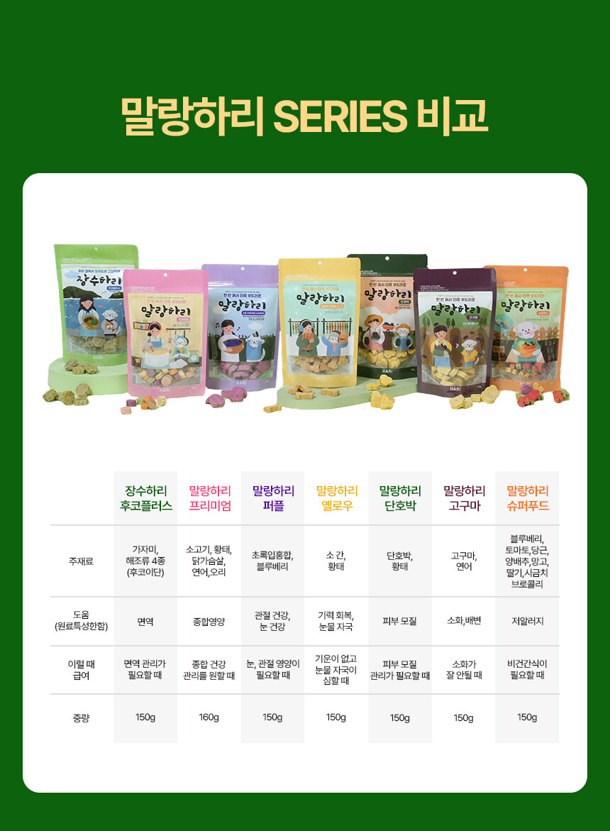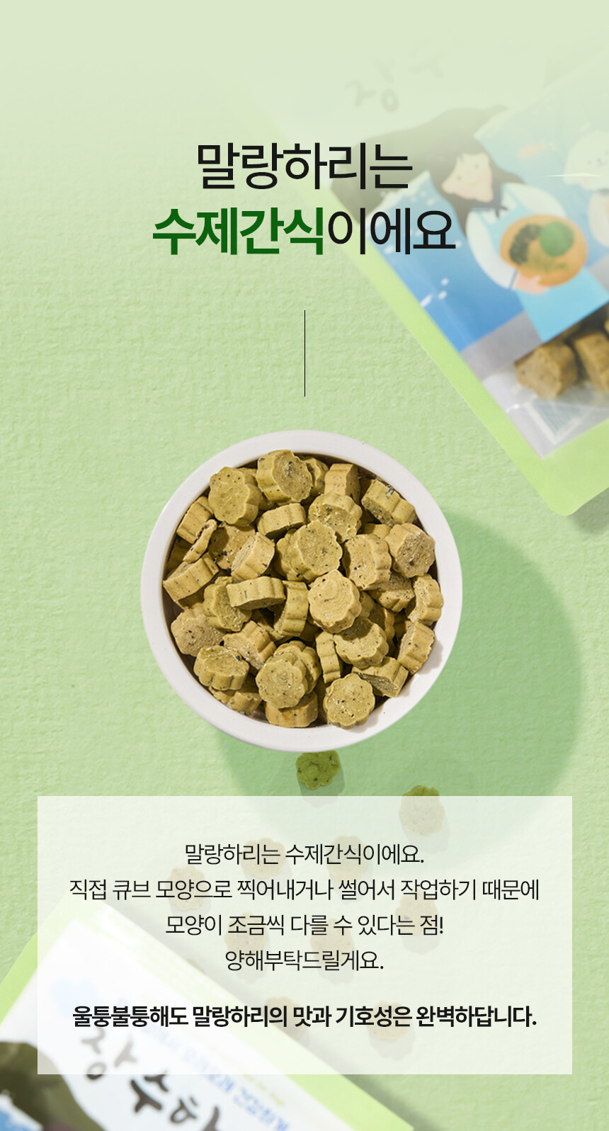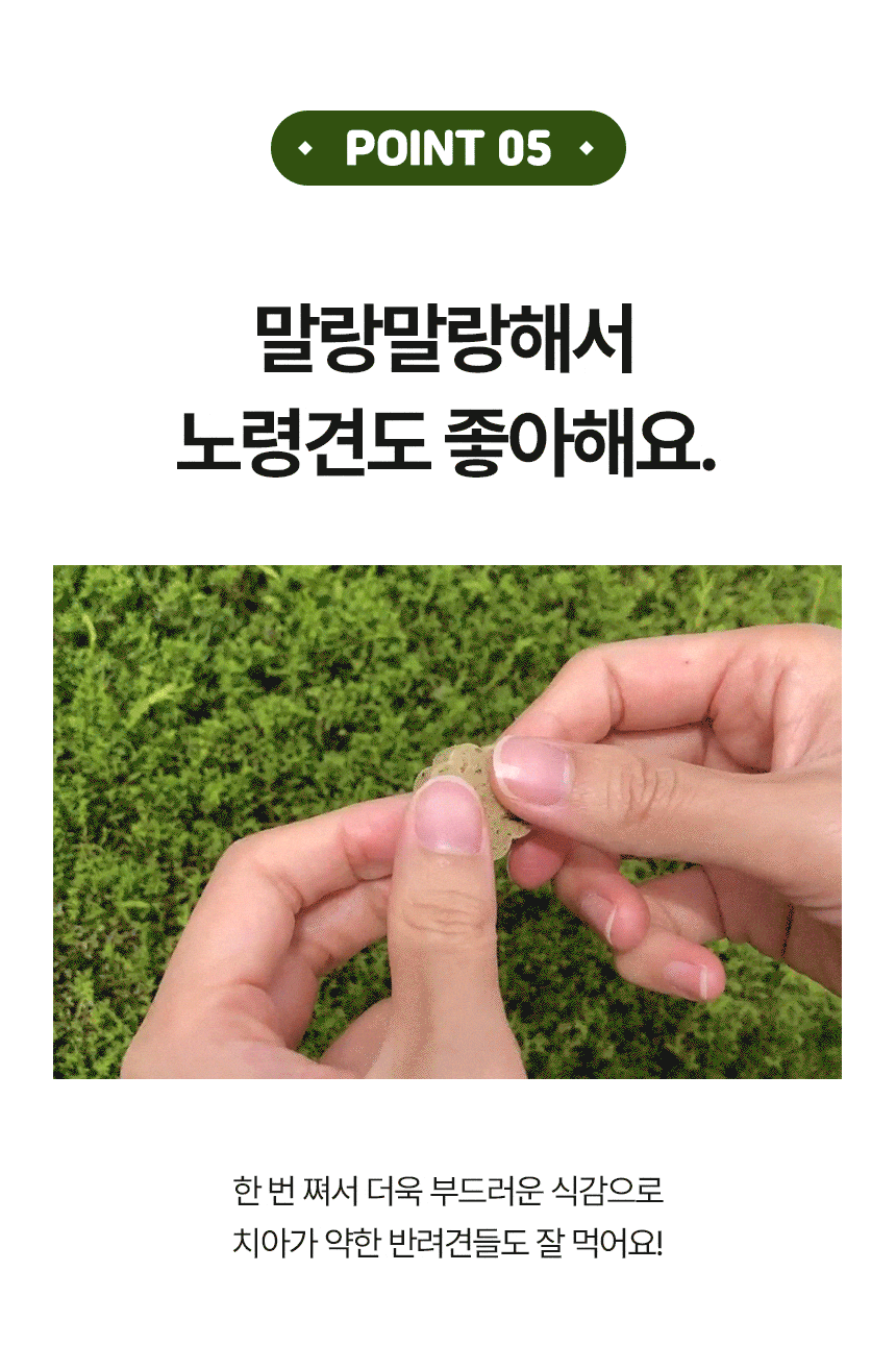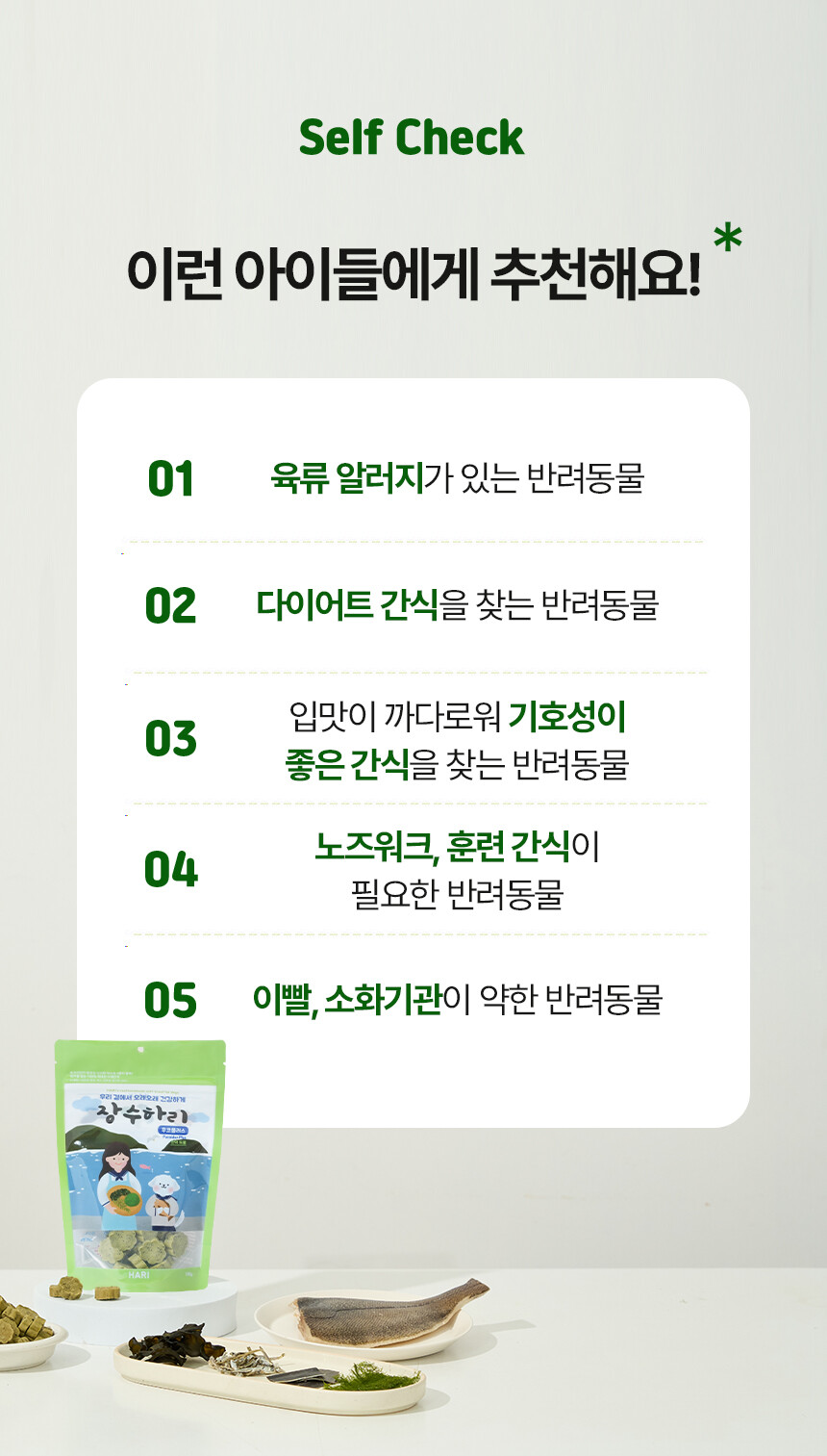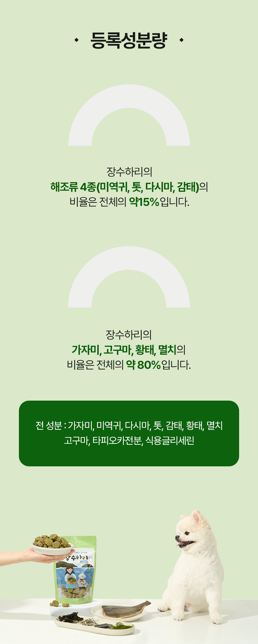 전 성분: 가자미, 미역귀, 다시마, 톳, 감태, 황태, 멸치, 고구마, 타피오카전분, 글리세린